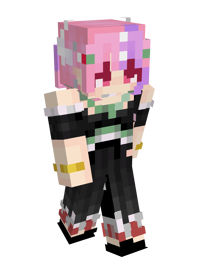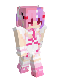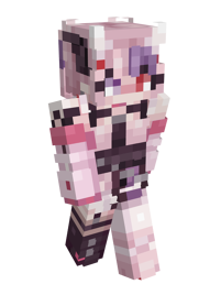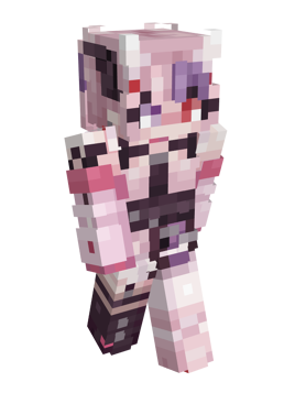 Her default skin is based off her typical Vtuber model, which wears a short, light pink dress with ruffles on the black leather straps and at the bottom of the skirt. Over her dress, she wears a black leather belt or corset with a chain over it, a dark pleated skirt element that goes over her left side, and a leather chest harness belt. On her neck, she wears a pink choker. She wears a light pink jacket with black, white, and red dots on her right sleeve in a way that exposes her shoulders and shows a tattoo on her right shoulder. The jacket's cuffs, that creates fingerless gloves, and its collar have a more vibrant shade of pink. She wears sheer stockings. The left stocking is white. The right stocking is black and has a garter. Her left boot is white and has a red sole. Her right boot is black with leather straps and a pink bell.